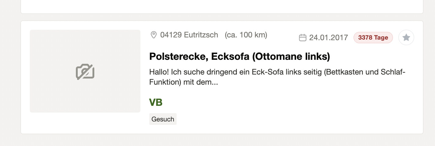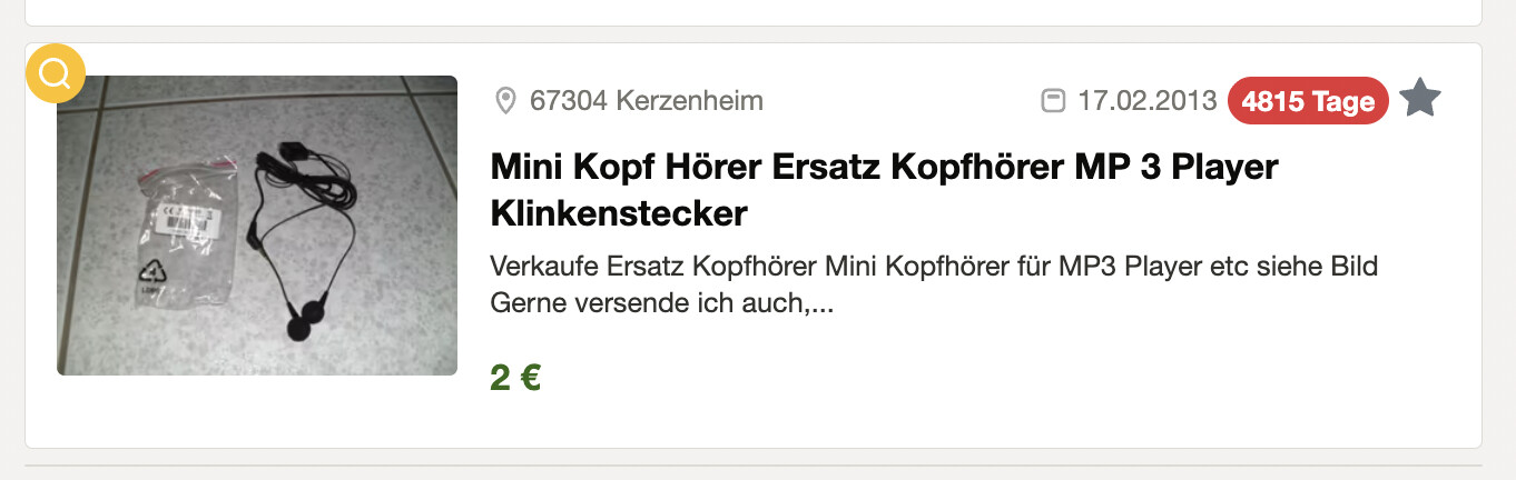 was wird wohl die älteste aktuell bei Kleinanzeigen gelistete Anzeige sein? Ich finde es witzig, zu sehen, dass Anzeigen aus 2017 und älter noch gelistet sind ![]()