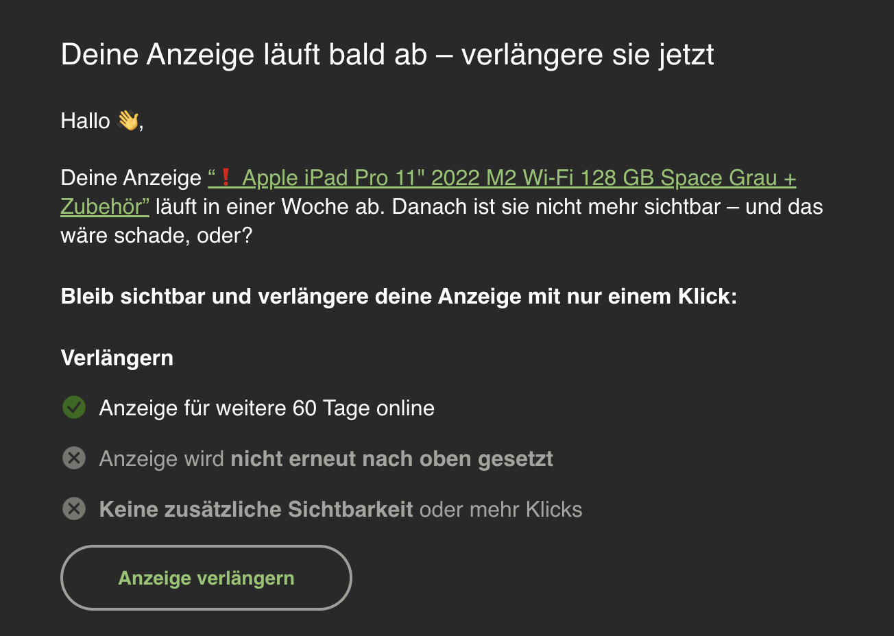 @Mondtiger mich würde einmal sehr die Email interessieren, die du bekommst: “Dein Artikel läuft in X Tagen aus” Ist die auch wirklich von Kleinanzeigen? Ich habe bei mir geschaut und beide Links führen zu kleinanzeigen.de….