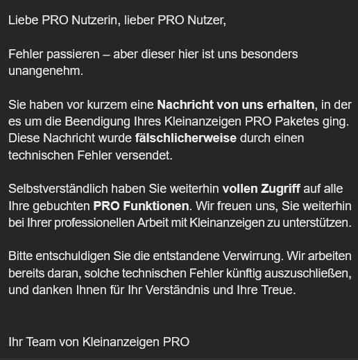 Vor einigen Monaten erhielt ich die Mitteilung, mein PRO‑Paket sei gekündigt, obwohl es ganz normal weiterlief. Zunächst hielt ich die Nachricht für einen Scam, doch zwei Tage später kam eine knappe Entschuldigung für den Fehler. Das war wenig professionell.