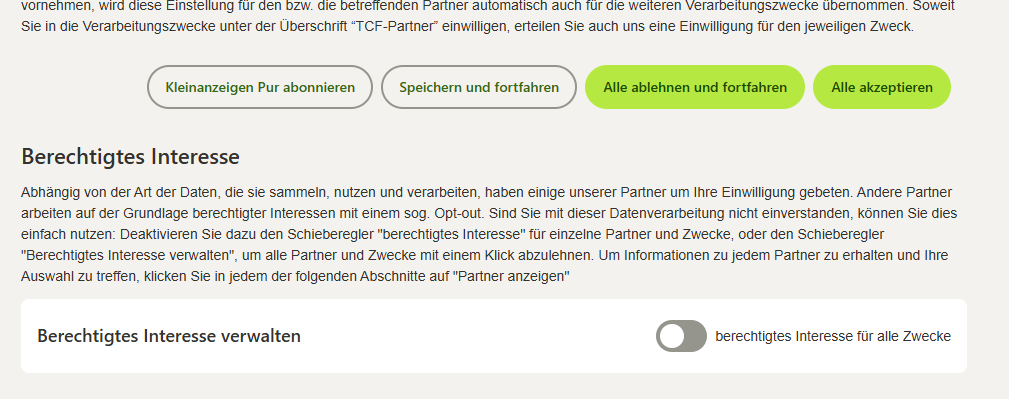 das perfide daran, es steht dort „Alle ablehnen und fortfahren“, deaktiviert aber nicht das berechtigte interesse verwalten. es aktiviert sich immer noch.