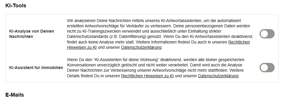 Bei mir (gewerblicher Account) wird die Option „Anonyme KI‑Analyse von Nachrichten“ allerdings gar nicht angezeigt. Offenbar unterscheidet Kleinanzeigen hier zwischen privaten und gewerblichen Profilen.