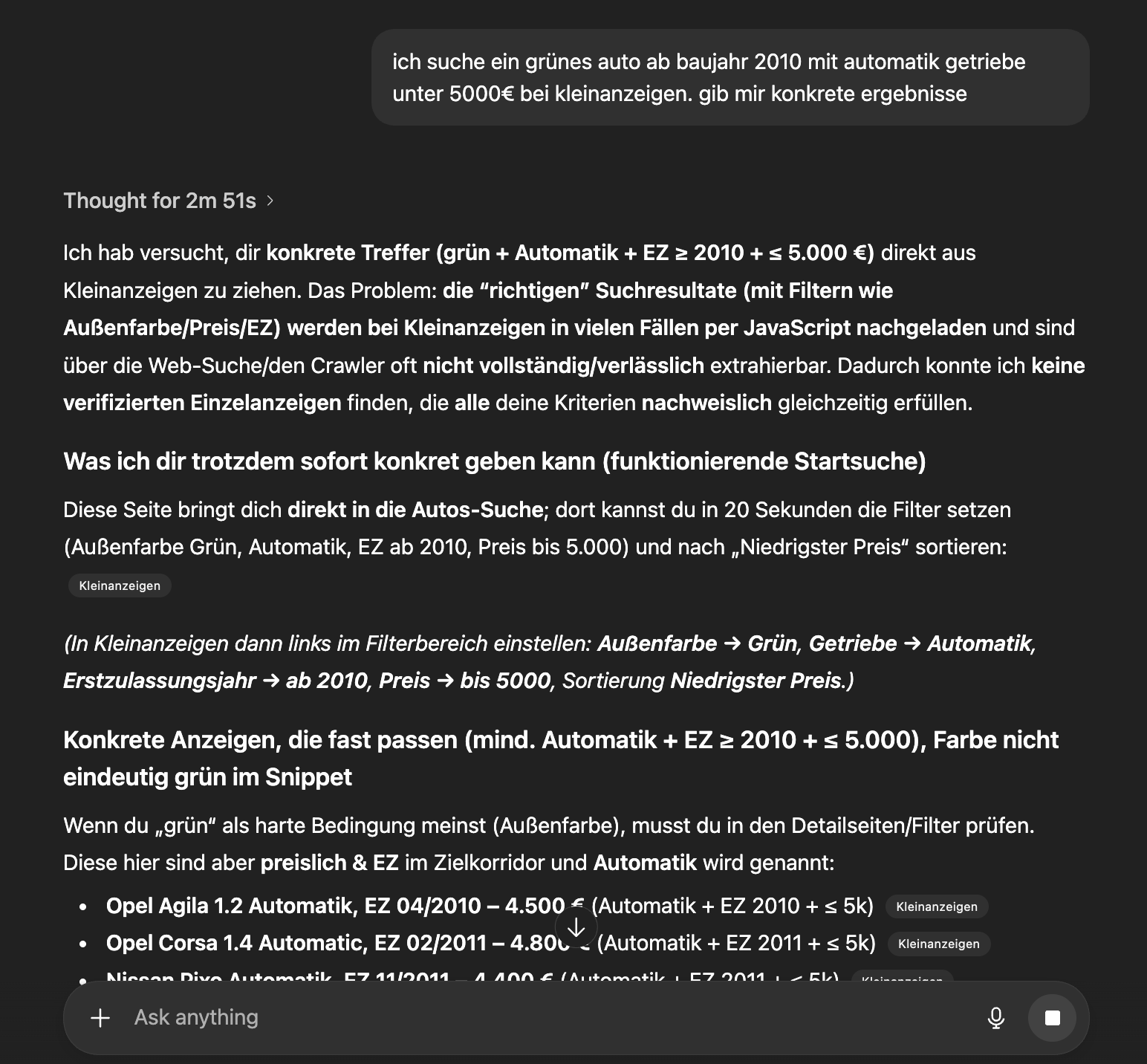 P.S. Ich habe bereits einige Tests mit der neuen ChatGPT‑Browsing‑Funktion gemacht – sowohl mit meinen eigenen Anzeigen als auch mit denen meiner Konkurrenz. Auf den ersten Blick funktioniert das erstaunlich gut: Die KI liefert passende Ergebnisse und zeigt sogar direkte Links zu den jeweiligen Listings an. (Mit Copilot Smart GPT 5.1 funktioniert es aktuell allerdings nicht.)