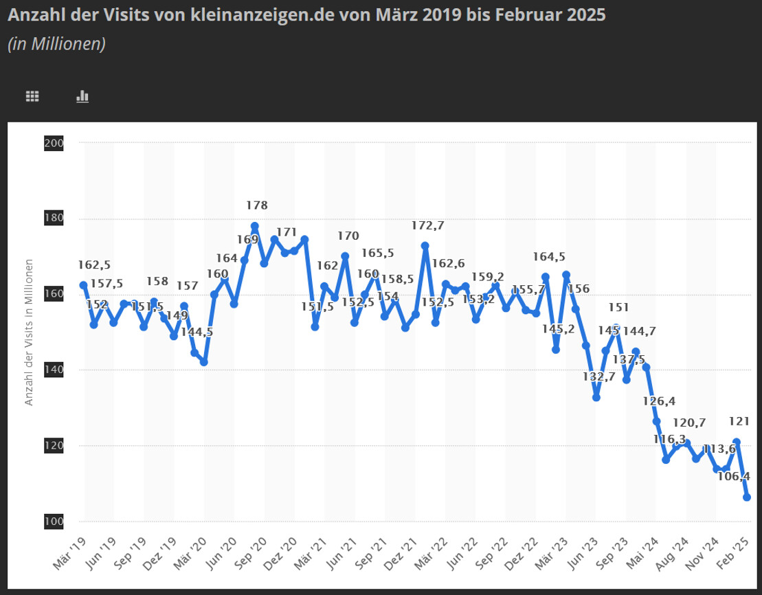 Dass viele Nutzer Alternativen nicht kennen, bestätigt eher das Grundproblem: Kleinanzeigen lebt immer noch von seiner alten Monopolstellung, nicht von Qualität. Der Rückgang bei Sichtbarkeit und Reichweite hat nichts mit „mehr Nutzern“ zu tun; die IVW‑Daten zeigen genau das Gegenteil. Es handelt sich um einen strukturellen Abwärtstrend, verstärkt durch steigende Preise, weniger Funktionen, sinkendes Vertrauen und rückläufige Verkäufe.