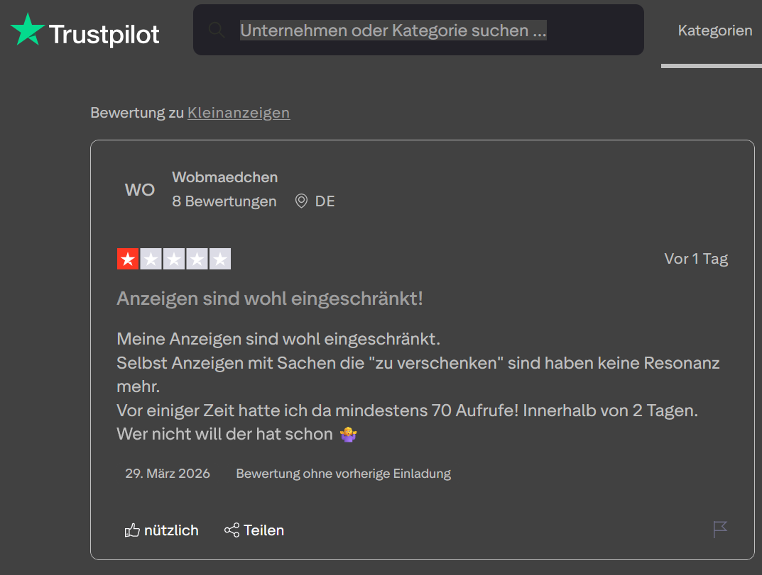 Aus meiner Sicht gehört Kleinanzeigen technisch und gestalterisch zu den schwächsten Plattformen am Markt. Selbst kleine Anbieter wie Shpock oder Flinkanzeigen bieten ein deutlich saubereres Layout, bessere Funktionen und eine wesentlich nutzerfreundlichere Erfahrung. Dominanz hält nicht ewig, vor allem dann nicht, wenn eine Plattform konsequent gegen die eigenen Nutzer arbeitet.