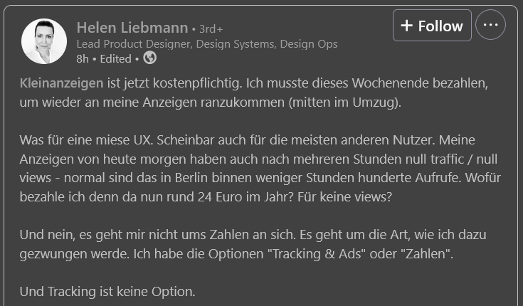 Kleinanzeigen spielt hier mit dem Feuer, testet die Geduld der Nutzer immer wieder aufs Neue und erhöht ständig die Preise, während gleichzeitig Sichtbarkeit, Funktionen, Vertrauen und Verkäufe sinken.