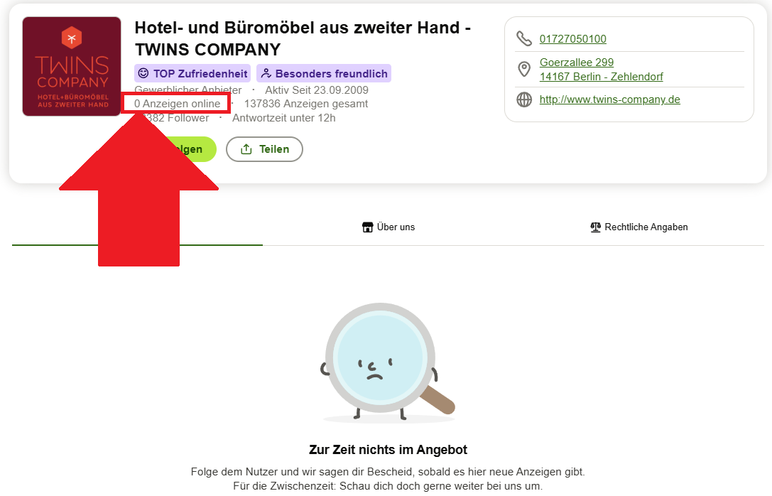 wenn ich aber über das profil gehe, steht da. der nutzer hat keine anzeigen…