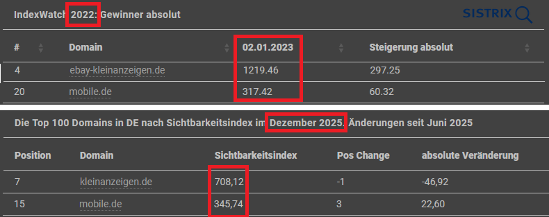 Kleinanzeigen.de verliert massiv Sichtbarkeit (-42%), Mobile.de gewinnt (+9%). Das ist kein Gefühl — das ist messbar.