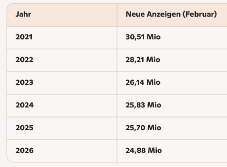 Und das kann jeder selbst überprüfen: Die neuen Anzeigen auf Kleinanzeigen laufen über fortlaufende Seriennummern. Wenn man diese über Wochen oder Monate verfolgt, sieht man klar, dass die Anzahl der neu eingestellten Anzeigen seit Jahren rückläufig ist. Das ist kein Gefühl, das ist messbar.