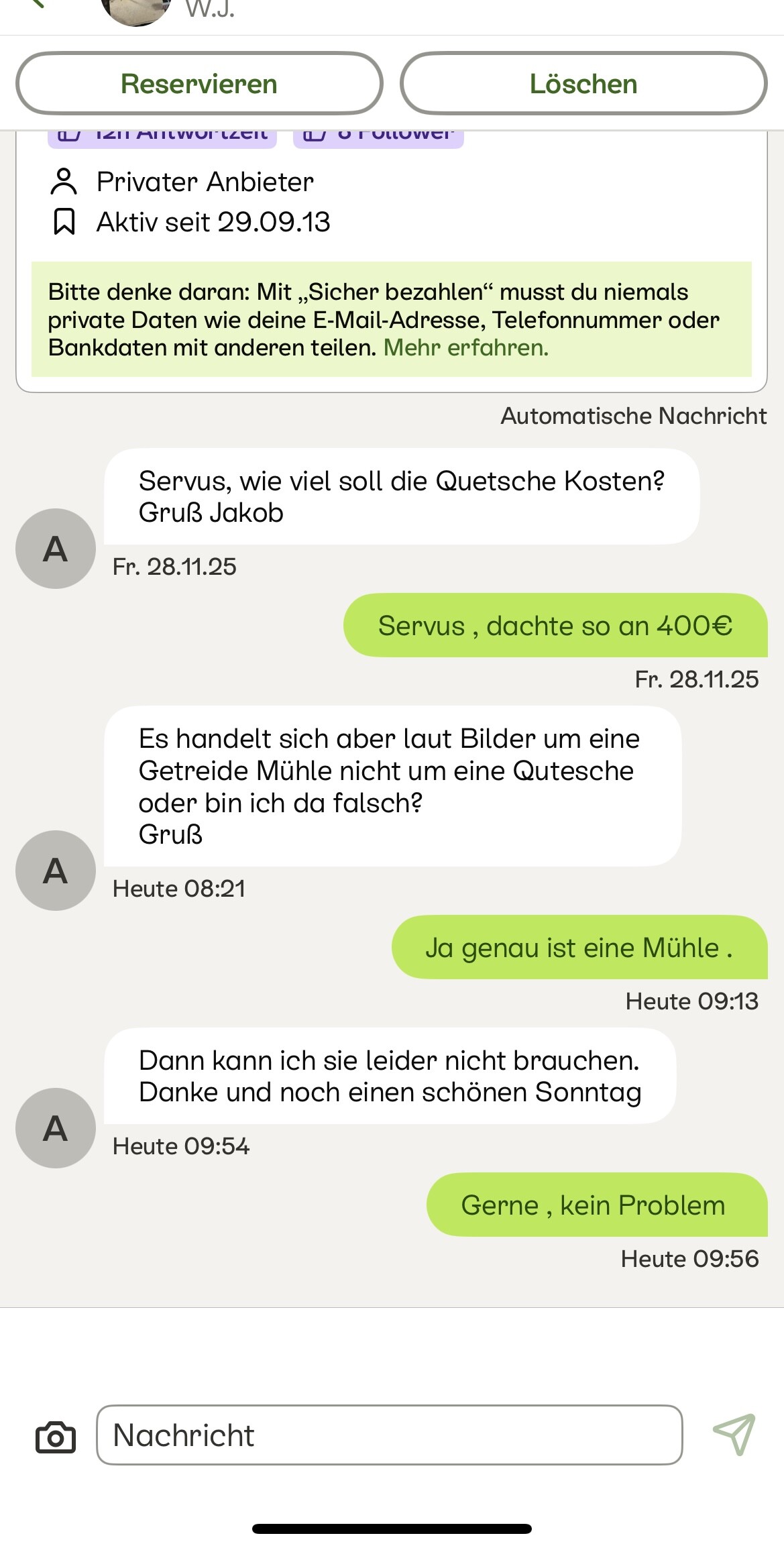 ich habe seit einigen Tagen mit Nachrichten in der App Probleme . Sobald ich einem Interessenten antworte , erscheint mein Namenskürzel ( in dem Fall :A ) auf seiner Seite im Chat . D.h. wenn ich neben seiner Nachricht auf das Kürzel drücke , komme ich auf meine eigene Anzeigenseite . Sobald er wieder antwortet , ist alles wieder normal. Anbei ein Foto von vorher und nachher zum Verständnis .