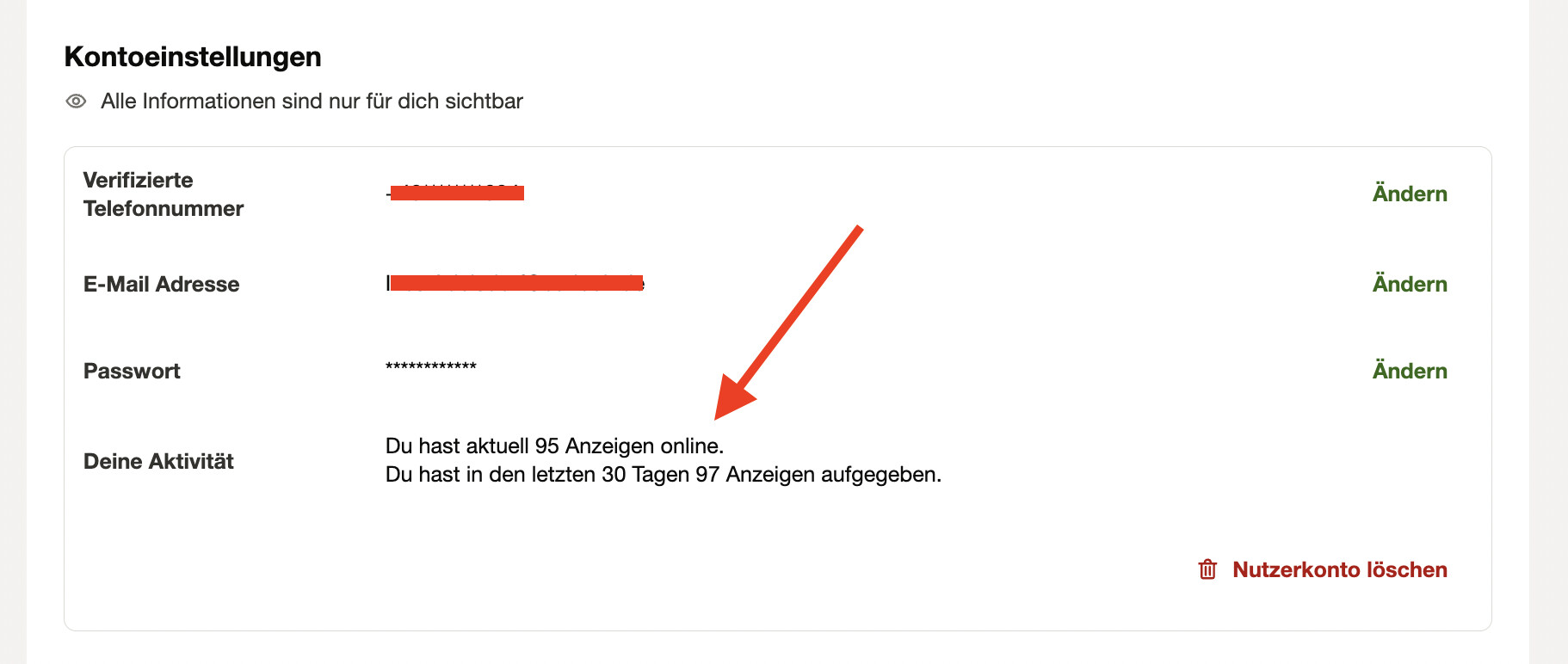 Das heißt: Du kannst nicht unbegrenzt viele Anzeigen aufgeben. Nach 100 aufgegebenen Anzeigen innerhalb von 30 Tagen ist erstmal Schluss, es sei denn, ältere Anzeigen „fallen raus“ aus dem 30-Tage-Fenster und geben wieder Kontingent frei. Ein maximales Limit scheint es aktuell für Privatnutzer nicht zu geben, also man kann 200 oder mehr Anzeigen online haben.