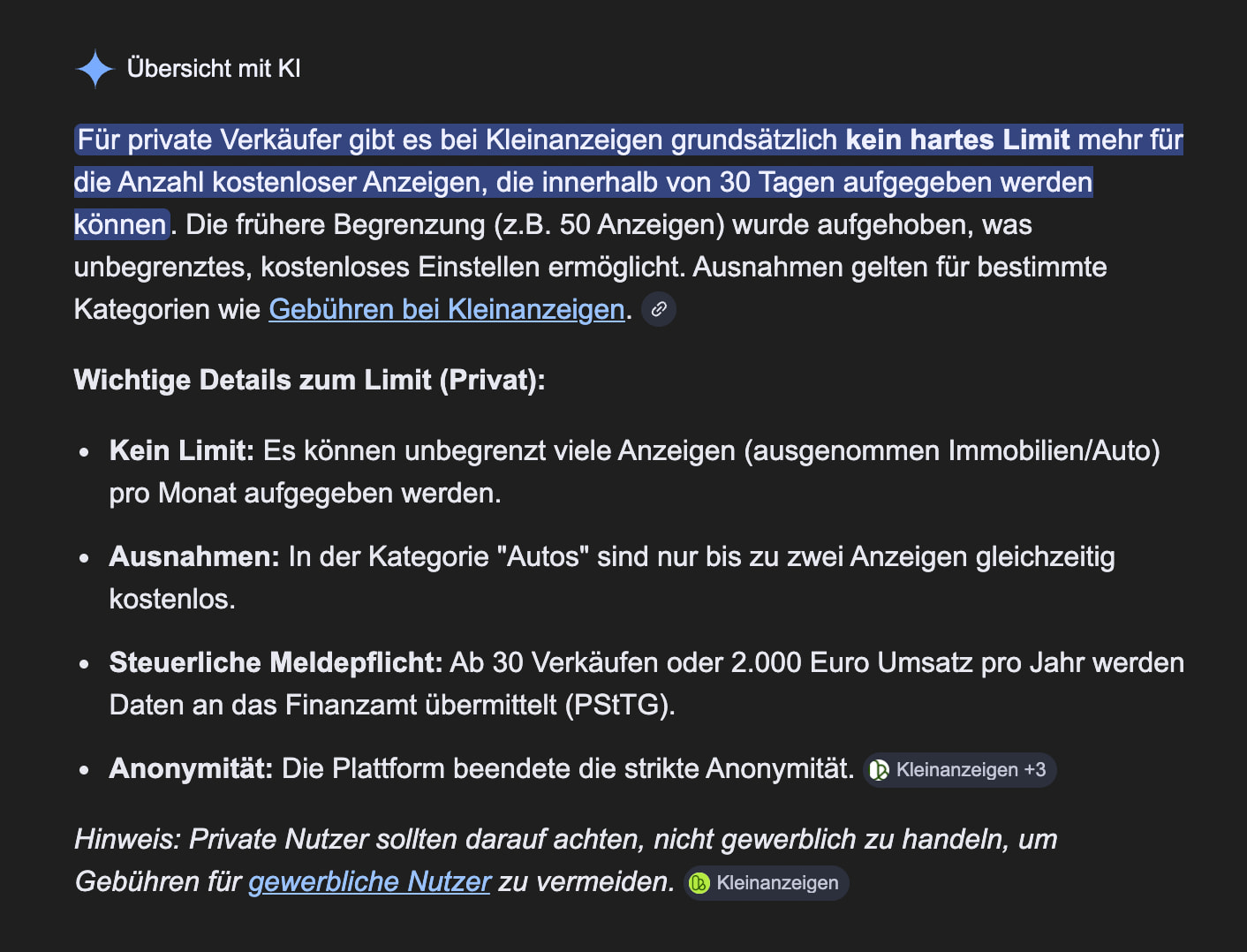 mir fällt immer wieder auf, dass es viel Verwirrung rund um das Anzeigenlimit gibt, sogar Googles KI-Übersicht gibt hier falsche Infos raus. Deshalb hier mal eine Klarstellung, wie es sich tatsächlich verhält.